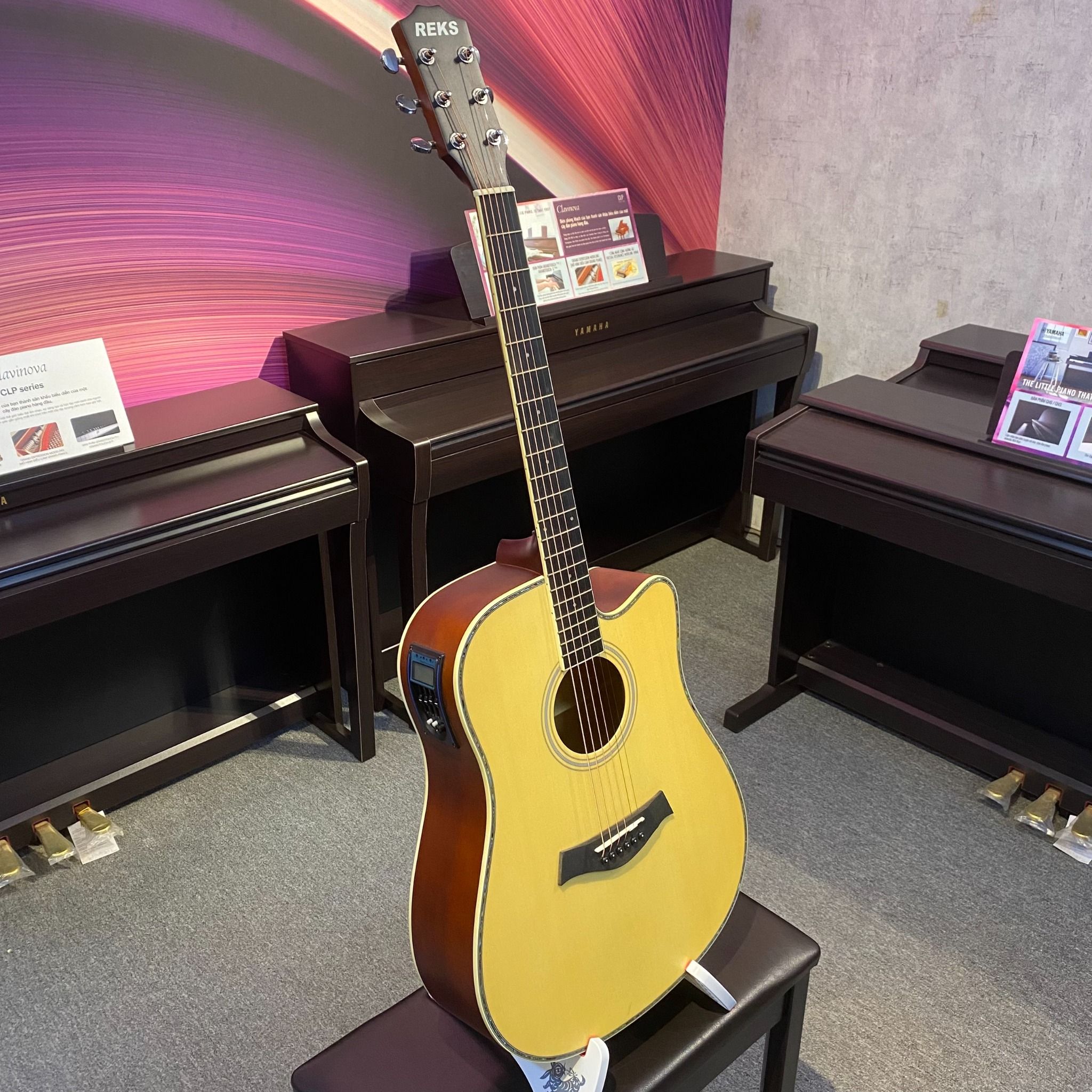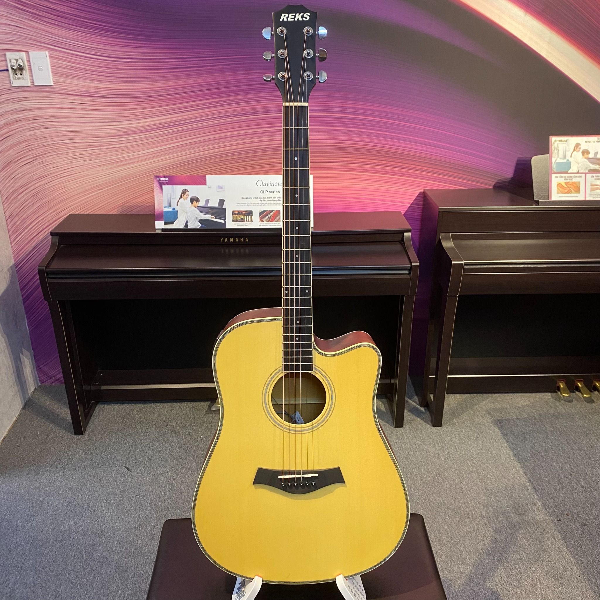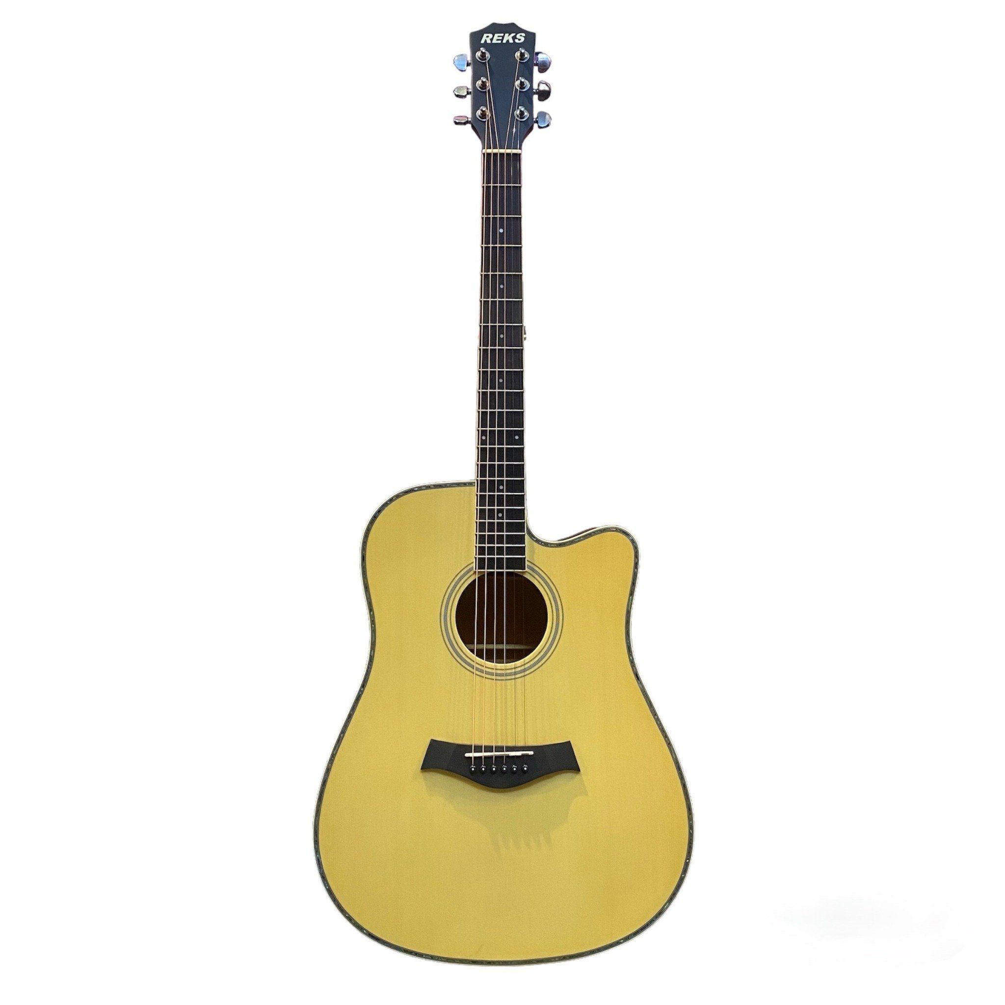 Reks một chiếc dreadnought cutaway được thiết kế với bộ khuếch đại trước để bạn khuếch đại khả năng chơi của mình trên bất kỳ hệ thống âm thanh nào bằng cách sử dụng cáp Jack to Jack và một bộ chỉnh đàn guitar tích hợp.